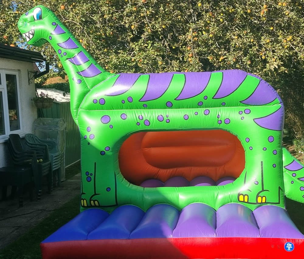 This Dino Bouncy castle measures 10ft (l) x 8ft (w) with the tall head of the dinosaur measuring at 9ft (h). The space required for this castle is 15ft in length, 11ft in width, and 10ft in height.