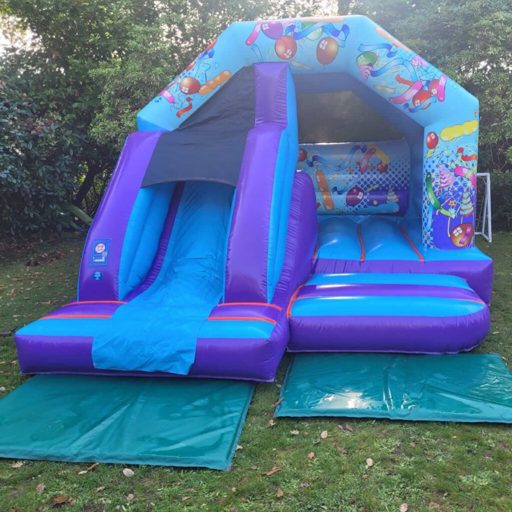 This bouncy castle is roofed, offering protection from our ever-increasing warm summers or a light spring shower. With steps on the inside to help you to the top of the slide, it suits most ages.