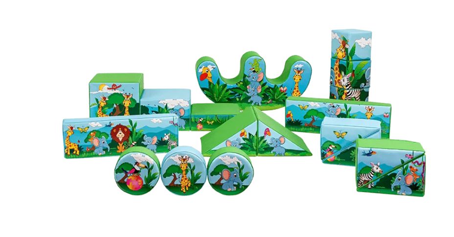 Included is an Uber fun ball pool, 15-piece soft play shapes, 2 sit-on bouncy animals, and a double rocker…All on our bright green soft play mats.