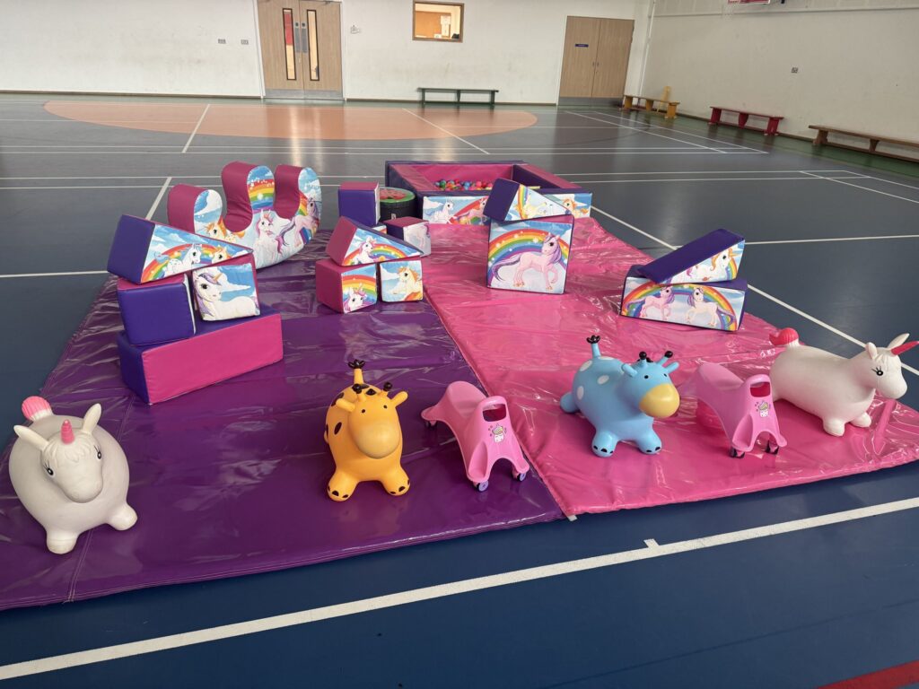 ALL SET UP ON OUR FABULOUS BRIGHT PINK AND PURPLE SOFTPLAY MAT!